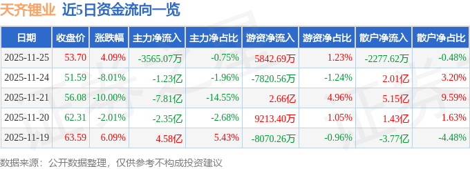 证券之星消息,截至2025年11月25日收盘,天齐锂业(002466)报收于53.7元,上涨4.09%,换手率6.12%,成交量90.35万手,成交额47.56亿元。
