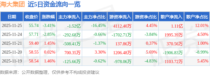 证券之星消息,截至2025年11月25日收盘,海大集团(002311)报收于55.74元,下跌3.41%,换手率0.99%,成交量16.47万手,成交额9.25亿元。