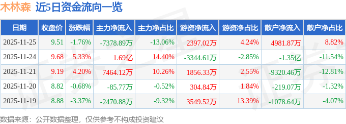 证券之星消息,截至2025年11月25日收盘,木林森(002745)报收于9.51元,下跌1.76%,换手率5.55%,成交量59.04万手,成交额5.65亿元。