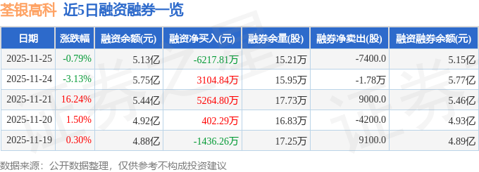 荃银高科融资融券信息显示,融资方面,当日融资买入1.1亿元,融资偿还1.72亿元,融资净偿还6217.81万元。融券方面,融券卖出6200.0股,融券偿还1.36万股,融券余量15.21万股,融券余额172.63万元。融资融券余额5.15亿元。
