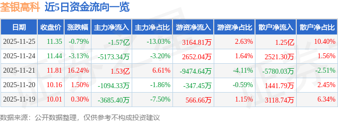 证券之星消息,截至2025年11月25日收盘,荃银高科(300087)报收于11.35元,下跌0.79%,换手率11.78%,成交量105.53万手,成交额12.05亿元。