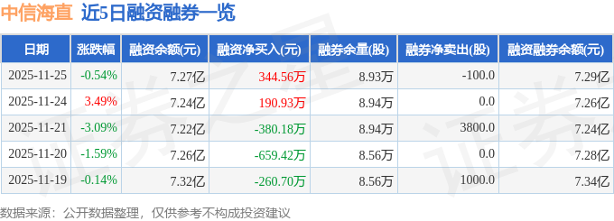 中信海直融资融券信息显示,融资方面,当日融资买入1809.45万元,融资偿还1464.89万元,融资净买入344.56万元。融券方面,融券卖出0.0股,融券偿还100.0股,融券余量8.93万股,融券余额181.73万元。融资融券余额7.29亿元。