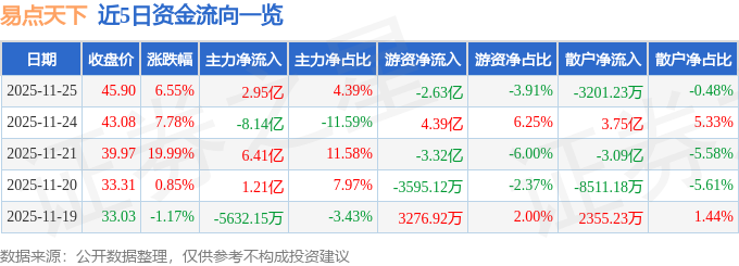 证券之星消息,截至2025年11月25日收盘,易点天下(301171)报收于45.9元,上涨6.55%,换手率38.48%,成交量146.56万手,成交额67.21亿元。