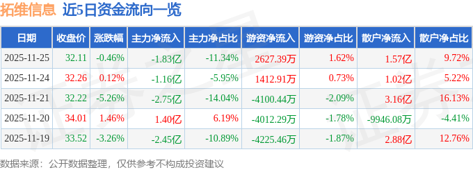 证券之星消息,截至2025年11月25日收盘,拓维信息(002261)报收于32.11元,下跌0.46%,换手率4.36%,成交量49.89万手,成交额16.18亿元。