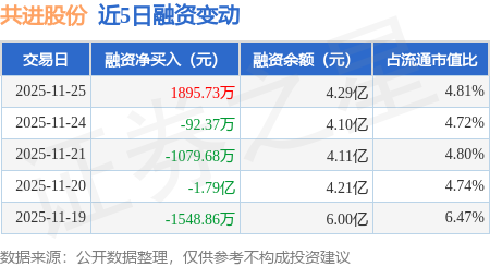 证券之星消息,11月25日,共进股份(603118)融资买入4685.14万元,融资偿还2789.41万元,融资净买入1895.73万元,融资余额4.29亿元,近20个交易日中有11个交易日出现融资净买入。