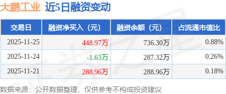 证券之星消息,11月25日,大鹏工业(920091)融资买入974.21万元,融资偿还525.24万元,融资净买入448.97万元,融资余额736.3万元。