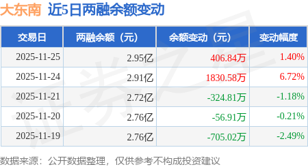 证券之星消息,11月25日,大东南(002263)融资买入1891.95万元,融资偿还1485.07万元,融资净买入406.88万元,融资余额2.95亿元,近20个交易日中有11个交易日出现融资净买入。
