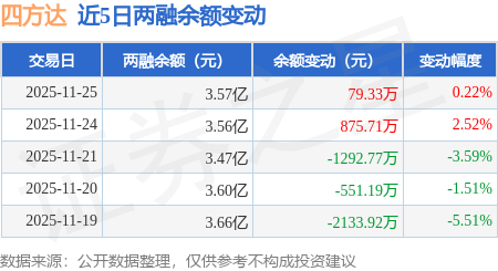 证券之星消息,11月25日,四方达(300179)融资买入5533.38万元,融资偿还5453.9万元,融资净买入79.48万元,融资余额3.57亿元。