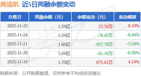 证券之星消息,11月25日,美迪凯(688079)融资买入638.19万元,融资偿还622.69万元,融资净买入15.5万元,融资余额1.59亿元。