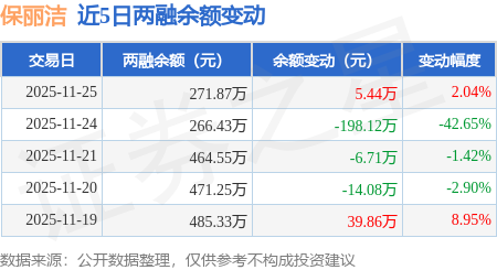 证券之星消息,11月25日,保丽洁(920802)融资买入38.25万元,融资偿还32.81万元,融资净买入5.44万元,融资余额271.87万元,近20个交易日中有12个交易日出现融资净买入。