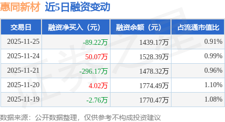证券之星消息,11月25日,惠同新材(920751)融资买入134.5万元,融资偿还223.72万元,融资净卖出89.22万元,融资余额1439.17万元。