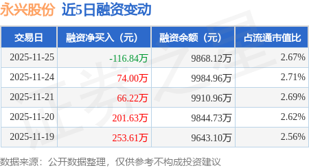 证券之星消息,11月25日,永兴股份(601033)融资买入264.01万元,融资偿还380.84万元,融资净卖出116.84万元,融资余额9868.12万元,近20个交易日中有13个交易日出现融资净买入。