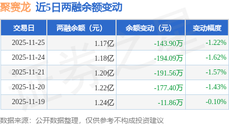 证券之星消息,11月25日,聚赛龙(301131)融资买入473.94万元,融资偿还617.84万元,融资净卖出143.9万元,融资余额1.17亿元。