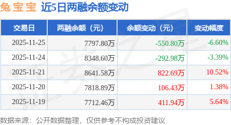 证券之星消息,11月25日,兔 宝 宝(002043)融资买入365.45万元,融资偿还897.34万元,融资净卖出531.89万元,融资余额7699.27万元,近20个交易日中有13个交易日出现融资净买入。