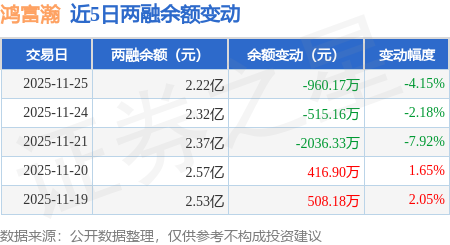 证券之星消息,11月25日,鸿富瀚(301086)融资买入1379.68万元,融资偿还2339.85万元,融资净卖出960.17万元,融资余额2.22亿元,近20个交易日中有11个交易日出现融资净买入。