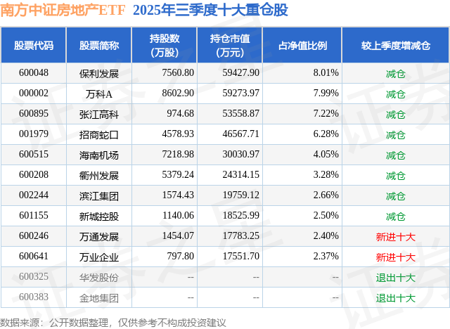 根据2025基金Q3季报公募基金重仓股数据,重仓该股的公募基金共20家,其中持有数量最多的公募基金为南方基金的南方中证房地产ETF。南方中证房地产ETF目前规模为74.18亿元,最新净值1.5548(11月25日),较上一交易日上涨0.74%,近一年下跌1.51%。该公募基金现任基金经理为罗文杰。罗文杰在任的基金产品包括:南方中证500ETF联接(LOF)A,管理时间为2013年4月22日至今,期间收益率为130.1%;南方中证500ETF,管理时间为2013年4月22日至今,期间收益率为136.82%;南方沪深300ETF,管理时间为2013年5月17日至今,期间收益率为141.79%;南方沪深300ETF联接A,管理时间为2013年5月17日至今,期间收益率为128.38%。