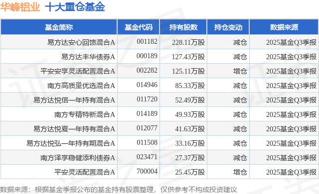 重仓华峰铝业的前十大公募基金请见下表: