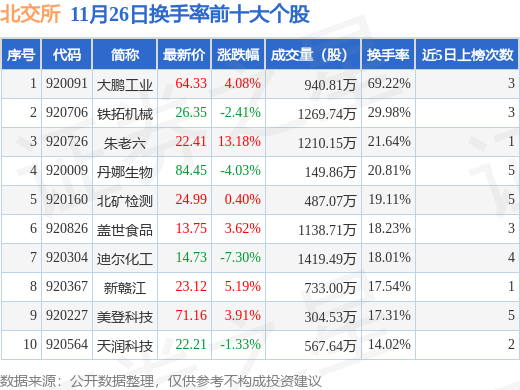 当日北交所换手率前10大个股中6只个股收涨,平均涨幅5.06%,其中大鹏工业(920091)以换手率69.22%排第一,8只个股近5个交易日中多次上榜。
