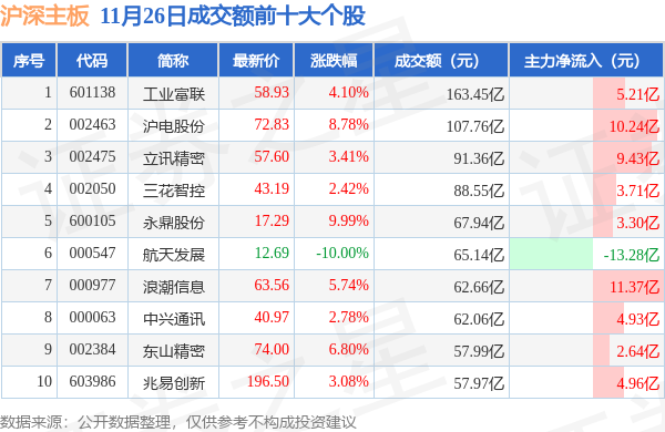 当日沪深主板成交额前10大个股中9只个股收涨,平均涨幅5.23%,其中工业富联(601138)以成交额163.45亿元排第一。从主力资金流入看,成交额前10大个股中有9只个股呈现主力资金净流入。