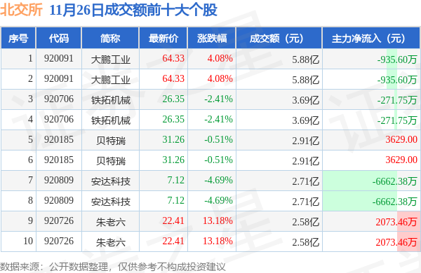当日北交所成交额前10大个股中4只个股收涨,平均涨幅8.63%,其中大鹏工业(920091)以成交额5.88亿元排第一。从主力资金流入看,成交额前10大个股中有4只个股呈现主力资金净流入。