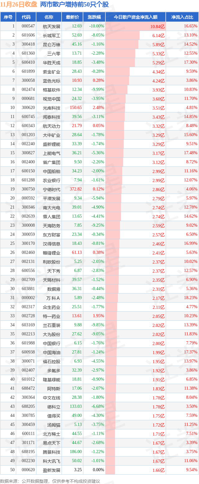 两市散户增持最多的前十只个股为: