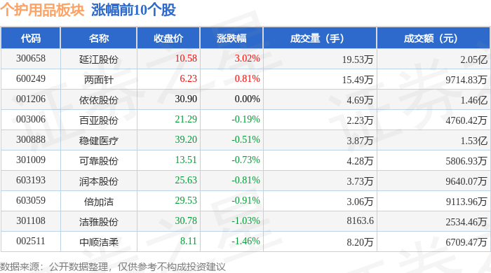证券之星消息,11月26日个护用品板块较上一交易日下跌0.69%,豪悦护理领跌。当日上证指数报收于3864.18,下跌0.15%。深证成指报收于12907.83,上涨1.02%。个护用品板块个股涨跌见下表: