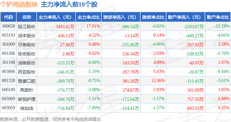 从资金流向上来看,当日个护用品板块主力资金净流出689.18万元,游资资金净流入711.29万元,散户资金净流出22.11万元。个护用品板块个股资金流向见下表:
