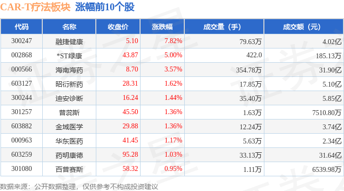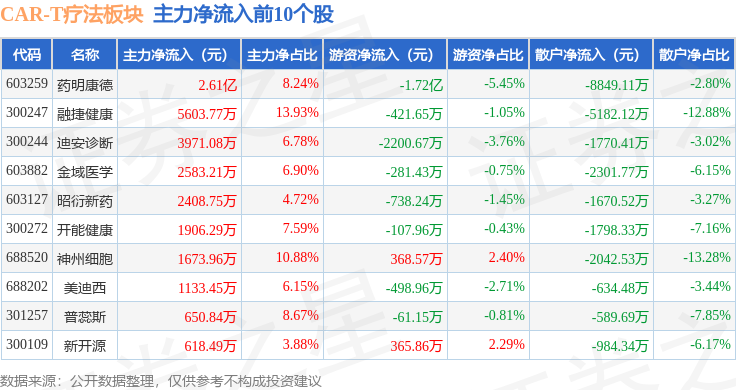 从资金流向上来看,当日CAR-T疗法板块主力资金净流入2.44亿元,游资资金净流出2.89亿元,散户资金净流入4457.9万元。CAR-T疗法板块个股资金流向见下表:
