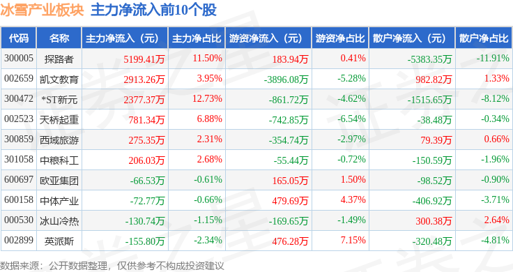 从资金流向上来看,当日冰雪产业板块主力资金净流出6.43亿元,游资资金净流出293.83万元,散户资金净流入6.46亿元。冰雪产业板块个股资金流向见下表: