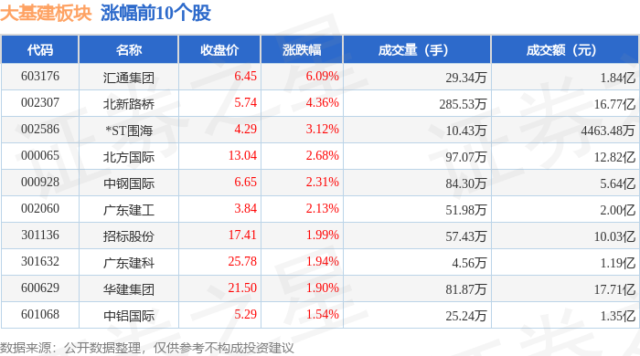 从资金流向上来看,当日大基建板块主力资金净流出2.1亿元,游资资金净流入2.72亿元,散户资金净流出6183.31万元。大基建板块个股资金流向见下表: