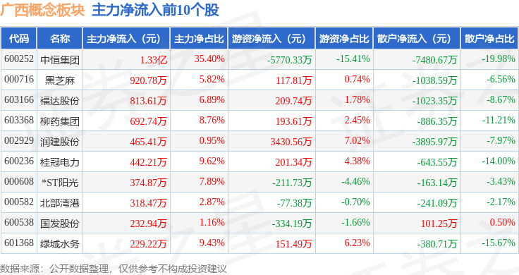从资金流向上来看,当日广西概念板块主力资金净流出4.7亿元,游资资金净流入4376.96万元,散户资金净流入4.26亿元。广西概念板块个股资金流向见下表: