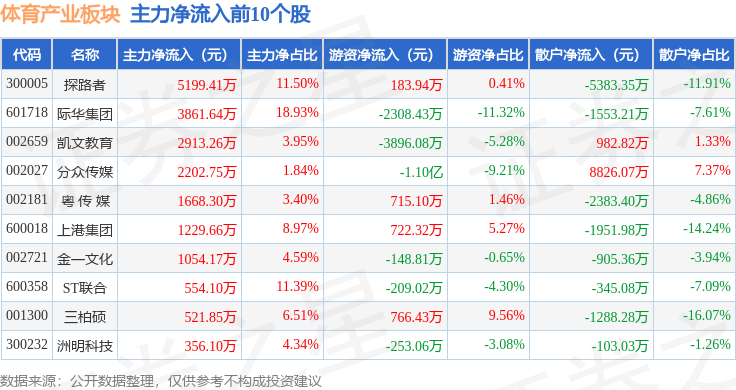 从资金流向上来看,当日体育产业板块主力资金净流出8.58亿元,游资资金净流出1.3亿元,散户资金净流入9.88亿元。体育产业板块个股资金流向见下表: