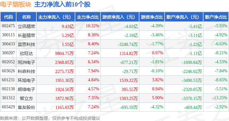 从资金流向上来看,当日电子烟板块主力资金净流入13.59亿元,游资资金净流出3.73亿元,散户资金净流出9.86亿元。电子烟板块个股资金流向见下表: