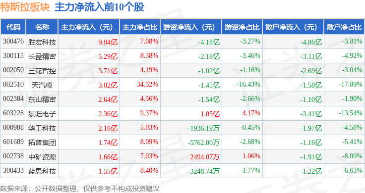 从资金流向上来看,当日特斯拉板块主力资金净流入9.04亿元,游资资金净流出3.03亿元,散户资金净流出6.01亿元。特斯拉板块个股资金流向见下表: