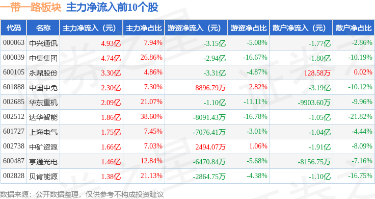 从资金流向上来看,当日一带一路板块主力资金净流出21.51亿元,游资资金净流出1.73亿元,散户资金净流入23.23亿元。一带一路板块个股资金流向见下表: