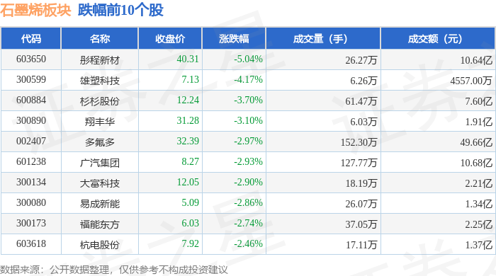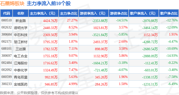 从资金流向上来看,当日石墨烯板块主力资金净流出12.46亿元,游资资金净流入4.24亿元,散户资金净流入8.22亿元。石墨烯板块个股资金流向见下表: