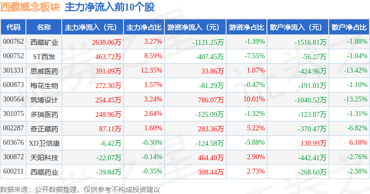 从资金流向上来看,当日西藏概念板块主力资金净流出2.27亿元,游资资金净流入795.71万元,散户资金净流入2.19亿元。西藏概念板块个股资金流向见下表: