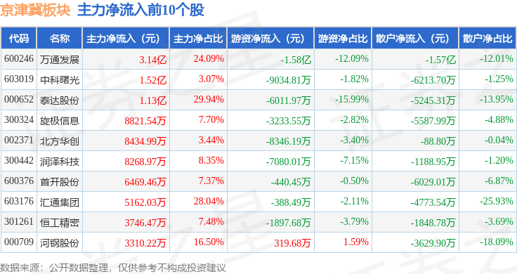 从资金流向上来看,当日京津冀板块主力资金净流出13.69亿元,游资资金净流出1.3亿元,散户资金净流入14.99亿元。京津冀板块个股资金流向见下表: