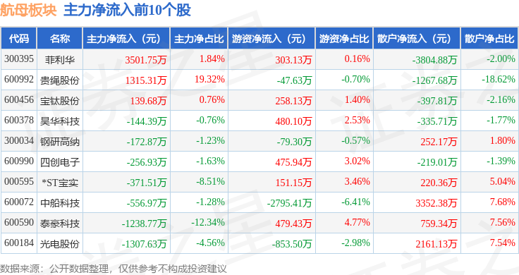 从资金流向上来看,当日航母板块主力资金净流出16.36亿元,游资资金净流入4.17亿元,散户资金净流入12.18亿元。航母板块个股资金流向见下表: