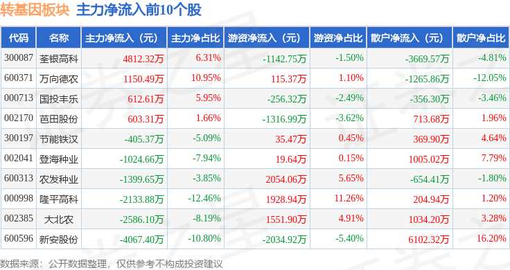 从资金流向上来看,当日转基因板块主力资金净流出1.31亿元,游资资金净流入6294.08万元,散户资金净流入6845.97万元。转基因板块个股资金流向见下表: