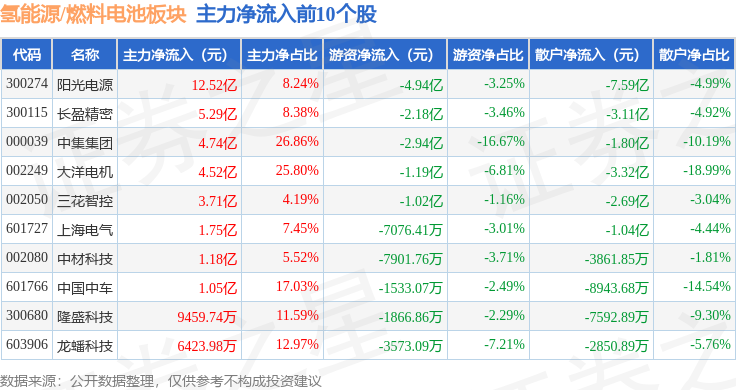 从资金流向上来看,当日氢能源/燃料电池板块主力资金净流入17.89亿元,游资资金净流出7.14亿元,散户资金净流出10.75亿元。氢能源/燃料电池板块个股资金流向见下表: