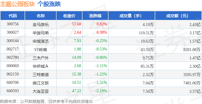 从资金流向上来看,当日主题公园板块主力资金净流出8363.67万元,游资资金净流入617.89万元,散户资金净流入7745.78万元。主题公园板块个股资金流向见下表: