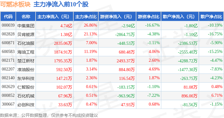从资金流向上来看,当日可燃冰板块主力资金净流入2.83亿元,游资资金净流出1.48亿元,散户资金净流出1.35亿元。可燃冰板块个股资金流向见下表: