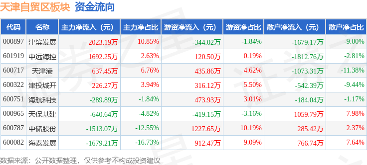 从资金流向上来看,当日天津自贸区板块主力资金净流入456.35万元,游资资金净流入2723.37万元,散户资金净流出3179.72万元。天津自贸区板块个股资金流向见下表: