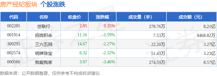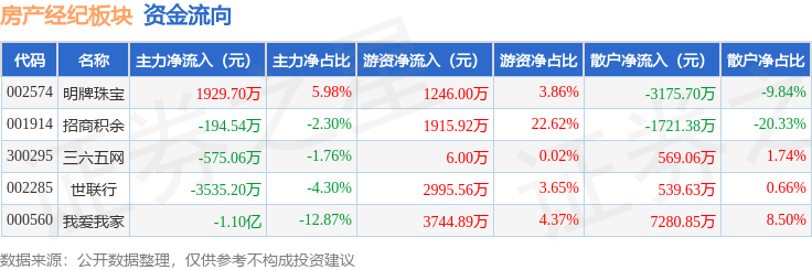 从资金流向上来看,当日房产经纪板块主力资金净流出1.34亿元,游资资金净流入9908.37万元,散户资金净流入3492.47万元。房产经纪板块个股资金流向见下表: