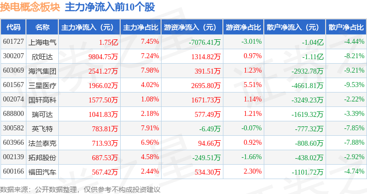 从资金流向上来看,当日换电概念板块主力资金净流出3.03亿元,游资资金净流入2272.65万元,散户资金净流入2.8亿元。换电概念板块个股资金流向见下表: