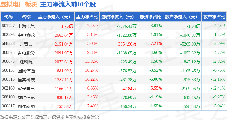 从资金流向上来看,当日虚拟电厂板块主力资金净流出11.54亿元,游资资金净流入3.52亿元,散户资金净流入8.02亿元。虚拟电厂板块个股资金流向见下表: