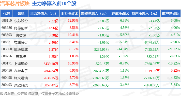 从资金流向上来看,当日汽车芯片板块主力资金净流入14.82亿元,游资资金净流出12.49亿元,散户资金净流出2.34亿元。汽车芯片板块个股资金流向见下表: