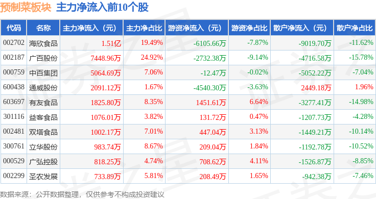 从资金流向上来看,当日预制菜板块主力资金净流出1.28亿元,游资资金净流出3735.67万元,散户资金净流入1.65亿元。预制菜板块个股资金流向见下表:
