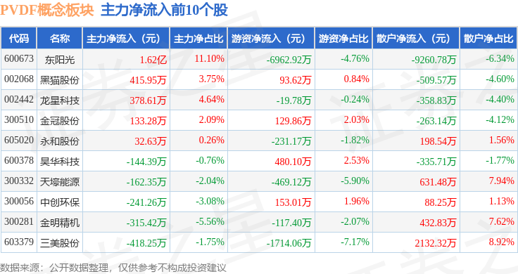 从资金流向上来看,当日PVDF概念板块主力资金净流出3.16亿元,游资资金净流入1.07亿元,散户资金净流入2.09亿元。PVDF概念板块个股资金流向见下表: